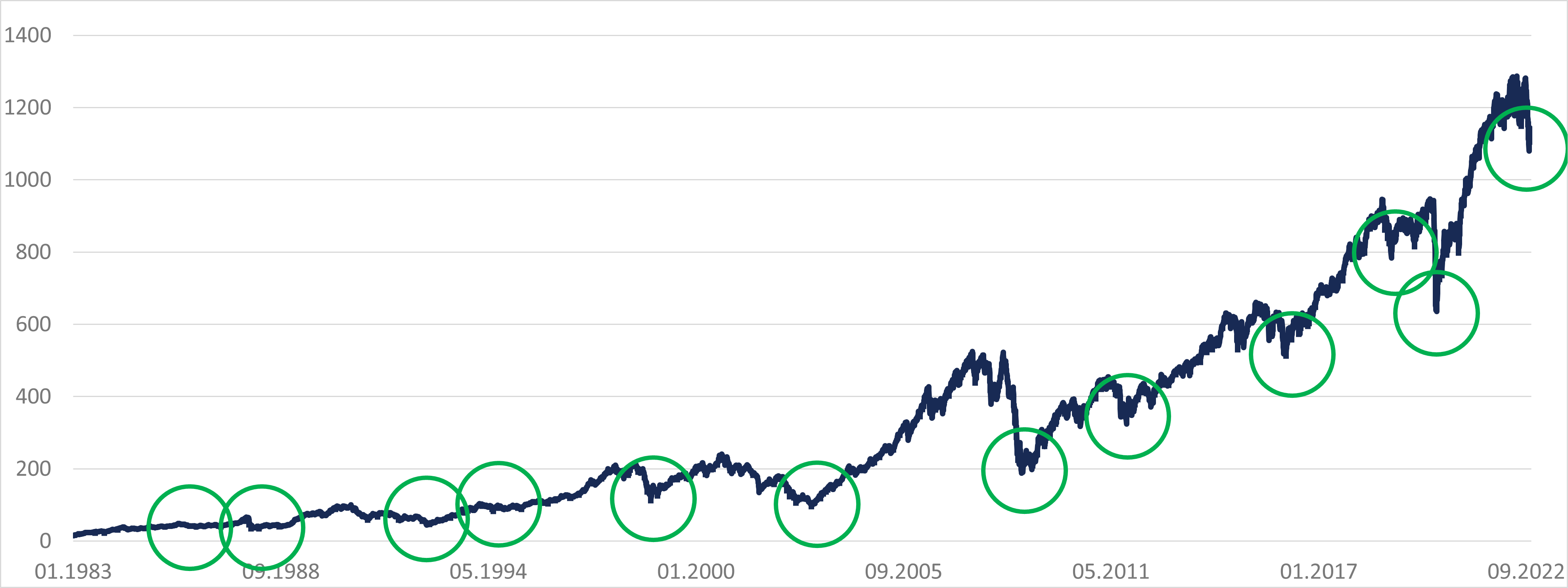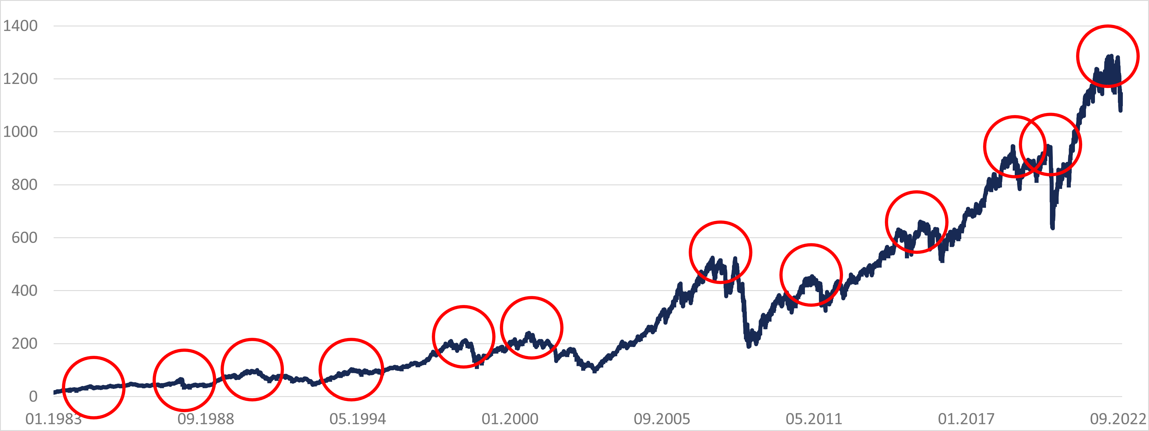 I noenlunde fugleperspektiv finner jeg tolv slike topper siden børsens moderne indekshistorie begynte ved inngangen til 1983. Hadde du gått inn i markedet den gang og dernest satt samme beløp på hver eneste topp, ville du nå – i oktober 2022 – ha oppnådd en årlig pengevektet snittavkastning på 9,9 prosent.