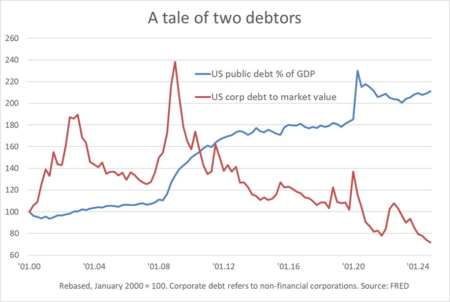 Om vi återigen mäter skulden i förhållande till BNP, har de amerikanska icke-finansiella företagen haft en ganska måttlig ökning sedan millennieskiftet – och sedan 2020 har nivån sjunkit från 56 till 48 procent av BNP. Skuldkvoten i samma bolag har faktiskt varit stabil eller svagt sjunkande ända sedan finanskrisen. Och om vi använder marknadsvärdet på eget kapital istället för det bokförda värdet, ser vi att soliditeten har stigit till hela 75 procent. Jag kan inte se att den här siffran har dykt upp i svärmen av skuldbekymmer.